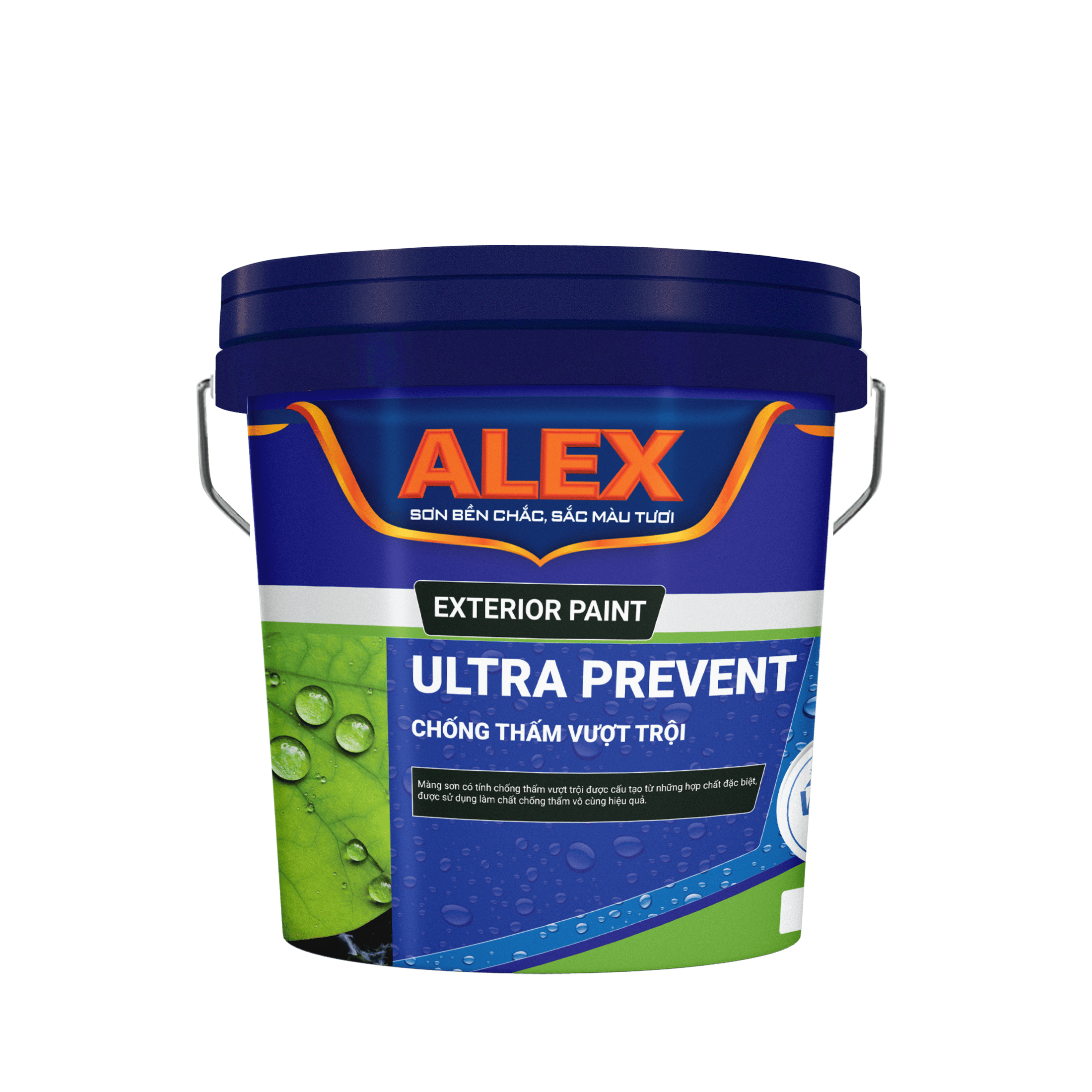 Liên hệ đại lý Tính toán lượng sơn Phối màu cho công trình của bạn SƠN CHỐNG THẤM VƯỢT TRỘI ALEX ULTRA PREVENT Alex Ultra Prevent là chất chống thấm có màu siêu cao cấp dành cho tường ngoại thất, bảo vệ ngôi nhà hòa hảo trước sự xâm nhập của nước mưa và hơi ẩm. Thông số kỹ thuật- Độ phủ lý thuyết: 10 - 12m2 /1L/1 lớp tuỳ thuộc vào điều kiện bề mặt- Đóng gói: 5 lít, 15 lít- Thời gian khô bề mặt: 45 phút/lớp ở 30°C.Thời gian chuyển tiếp: Tối thiểu 6-8 giờ điều kiện bình thường. Tính năng nổi bật Thông tin chi tiếtThành phần cấu tạo Nước, Nhựa acrylic, chất chống thấm, chất phụ gia Công dụng Là chất chống thấm dùng cho các cấu trúc xi măng và bê tông như sau: - Sân thượng - Nền nhà, Tường đứng của nhà - Bể chứa nước, đường hầm - Sàn nhà vệ sinh Hoàn thiện - Mờ - Màu: Trắng khi sử dụng xi măng trắng, Xám đậm khi sử dụng xi măng thường Dữ liệu áp dụng Chuẩn bị bề mặt: - Đảm bảo bề mặt phải sạch, khô và ổn định. - Màng sơn cũ, chất bẩn, vữa, nấm, mốc... Không ổn định phải được tẩy sạch bằng nước với áp lực cao hoặc dụng cụ cạo thích hợp. - Trong trường hợp tường quá khô và các bề mặt hút nước, nên làm ẩm bằng nước sạch trước khi thi công ALEX ULTRA PREVENT. Phương pháp thi công: - Dùng cọ quét, con lăn. Thực hiện 2 – 3 lớp Mức tiêu hao sơn: - Theo lý thuyết: 10 - 12m2 /1L/1 lớp tuỳ thuộc vào điều kiện bề mặt Pha trộn: - Với tỷ lệ không quá 5% nước sạch, khuấy đều trước khi sử dụng - KHÔNG CẦN PHA TRỘN VỚI XI MĂNG Vệ sinh: - Rửa các dụng cụ bằng nước sạch ngay sau khi dùng Bảo quản: - Đậy chặt nắp thùng. Lưu trữ ở nơi khô, mát và thoáng, nhiệt độ từ 5°C - 40°C. Lưu ý: - Khuyến cáo thi công thêm 2-3 lớp sơn lót chống kiềm ngoại thất để màu sắc sản phẩm được bền lâu - Hạn chế thi công khi nhiệt độ thấp hơn 10°C và độ ẩm lớn hơn 80%. Tránh tiếp xúc trực tiếp với da. Sử dụng dụng cụ bảo hộ thích hợp. - Không thi công ALEX ULTRA PREVENT trên các bề mặt đã có chống thấm gốc dầu hoặc trên các nền sàn đã được làm láng. - Với các vết nứt nhỏ, quét 3 lớp ALEX ULTRA PREVENT. Với các vết nứt lớn thì phải đục rộng theo hình chữ V và trét lại bằng hỗn hợp: 3 Cát – 1 Xi măng – 3 ALEX ULTRA PREVENT trước khi thi công chống thấm Xem thêm